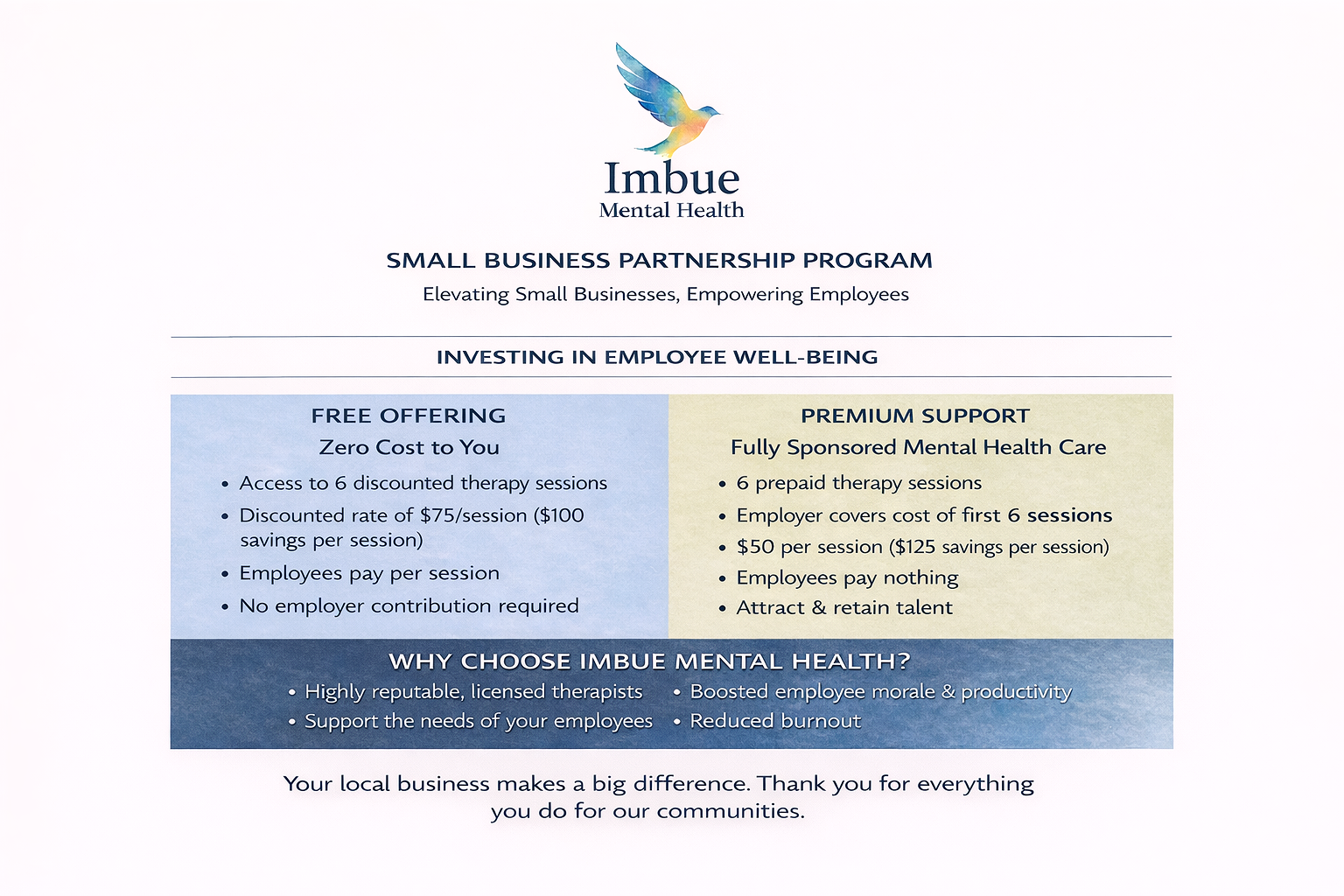 Elevate your small business by providing quality mental health care through the Imbue Small Business Partnership Program, which offers employer-sponsored and no-cost EAP alternatives.